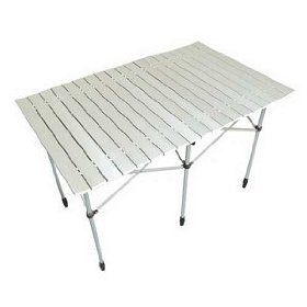 Features: All aluminum top won't melt like the vinyl covered tables when you put a hot pot on it. Legs adjust for uneven ground with a quick turn of the wrist from 27.5"-33" high. El Grande top is 27.5" x 43.5". Weight: 12 pounds.